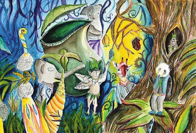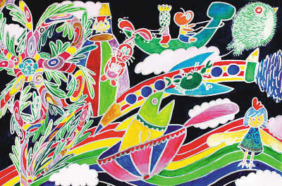 這個奇怪的天堂里有飛翔的兔子,也有準(zhǔn)備出航的水果們,還有躲在雨傘里的魚……皓茵小朋友,你是怎么想的啊?