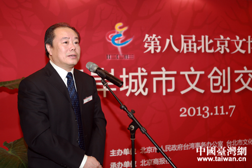 北京市臺辦副主任黃塞溪在第八屆北京文博會兩岸城市文創(chuàng)交流酒會上宣布,為進一步深化兩岸文創(chuàng)交流與合作,北京市相關文化單位推出三項新舉措。(中國臺灣網(wǎng) 王偉 攝)
