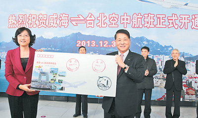 2013年12月31日,山東威海與臺北的空中直航首航成功。該航線飛行時間約2小時40分鐘。圖為威海市市長張惠(前左)與臺灣中華航空公司董事長孫洪祥(前右)展示直航成功首日封。陳宏青攝(新華社發)