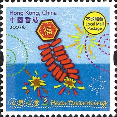 香港2007年12月28日推出的一套4枚《心思心意》郵票,有一枚直接以一掛燃放的鞭炮為主圖(圖③),鞭炮上端還印著一個大大的“!弊,構圖簡潔明了,寓意深刻。(文/司徒一凡)