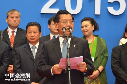 臺灣貿易中心董事長梁國新出席2015天津臺灣名品博覽會開幕式并致辭。(中國臺灣網 張潔 攝)
