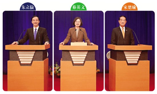 綜合臺媒報道:臺灣2016“大選”自25日起至27日,將進入每日皆有政見發(fā)表會或辯論會的“超級周末”。“總統(tǒng)”候選人政見發(fā)表會在25日晚首先在民視舉行,候選人分3輪發(fā)表政見,每輪每人10分鐘,抽簽后依序由宋、蔡、朱發(fā)表政見,其中朱蔡二人發(fā)言針鋒相對,主要論及經(jīng)濟、兩岸議題,反觀宋楚瑜雖有質(zhì)問二人,但顯然被冷落。