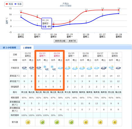 據臺媒報道,日本民營氣象協會網站日前曾一度預報,周末南下報到的寒流將影響臺灣低溫僅3度,臺北甚至可能在24日下雪,21日再度預測,24、25日連續兩天氣溫最低僅1度,且都有可能下雪。