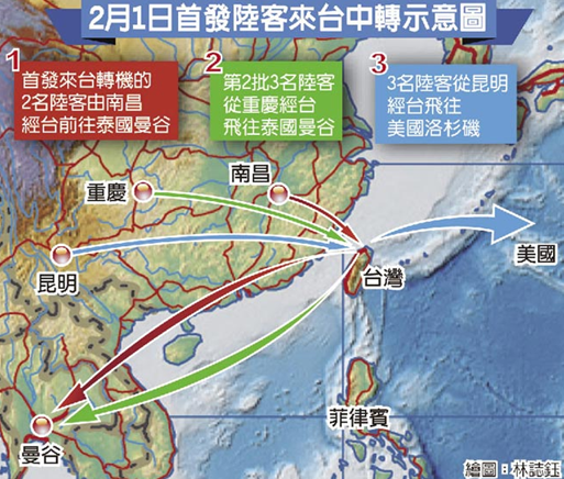 今年1月5日,國臺(tái)辦表示,為落實(shí)兩岸領(lǐng)導(dǎo)人會(huì)面成果,大陸有關(guān)方面擬試點(diǎn)開放大陸居民經(jīng)臺(tái)灣桃園機(jī)場(chǎng)的中轉(zhuǎn)業(yè)務(wù),南昌、昆明、重慶為首批試點(diǎn)城市。大陸居民在上述三城市可持護(hù)照及聯(lián)程機(jī)票和赴第三地的登機(jī)牌經(jīng)臺(tái)灣桃園機(jī)場(chǎng)進(jìn)行不出機(jī)場(chǎng)的中轉(zhuǎn)。