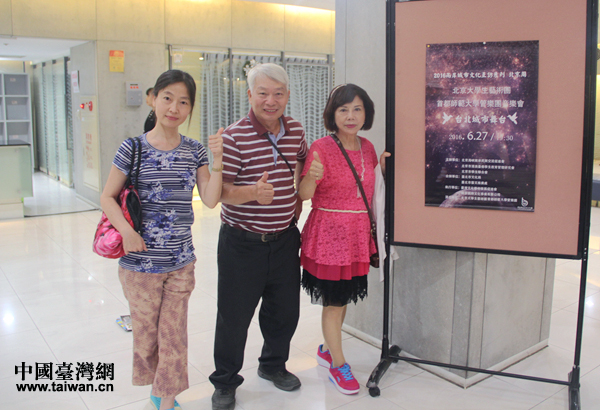 臺北觀眾陳先生、鐘女士(右)與楊小姐(左)散場后在演出海報前拍照留影,要把照片發(fā)上臉譜網(wǎng)(facebook),將北京學(xué)子送來的精彩和感動傳遞給更多臺灣民眾。(中國臺灣網(wǎng) 王思羽 攝)