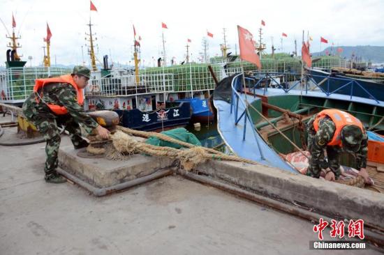 資料圖:7月8日,今年第1號臺風“尼伯特”在臺灣省臺東縣太麻里鄉(xiāng)沿海登陸后,已進入臺灣海峽,向福建沿海逼近。福建省公安邊防總隊羅源縣邊防大隊調(diào)集官兵堅守羅源灣港務(wù)碼頭二級避風港,開展安全巡查,勸離個別回流漁船民。陳昭影 攝