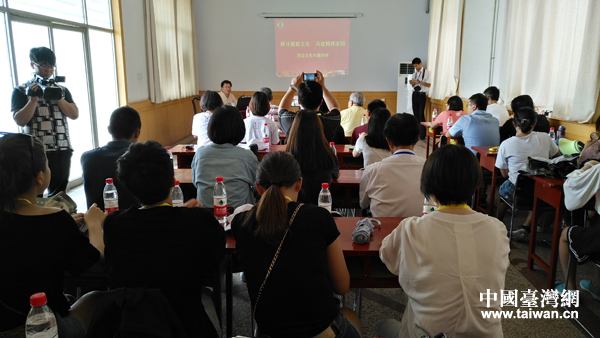 山西解州關(guān)帝廟文物保管所所長(zhǎng)衛(wèi)龍向臺(tái)灣青年參訪團(tuán)講解關(guān)公文化。(中國(guó)臺(tái)灣網(wǎng) 王文英 攝)