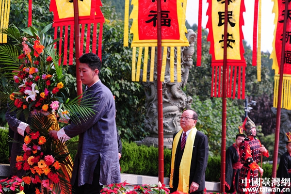 中國國民黨前副主席蔣孝嚴獻進獻花籃。(中國臺灣網 雍紫薇 攝)