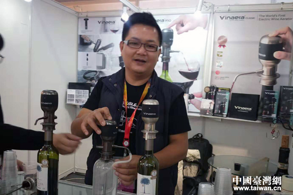 參展商鐘葉儀來自臺北,他自主研發、全球首創的Vinaera Pro電子醒酒器于2014年推出后,就相繼獲得2014德國紅點設計至尊大獎、2017日本(G-MARK)優良設計獎、2017臺灣金點設計獎、2017倫敦國際創意競賽獎、2017美國IDA設計金獎、2018比利時歐洲設計銀獎。(中國臺灣網 王怡然 攝)
