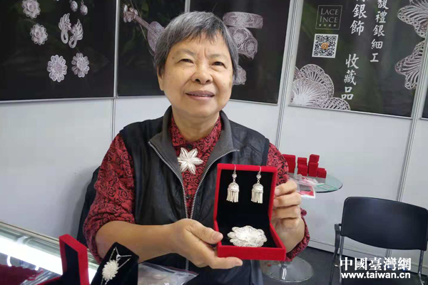 來自新北的劉慈悲向記者展示自己的掐絲銀飾作品。(中國臺灣網 王怡然 攝)