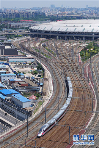 6月26日,“復興號”G123次列車駛出北京南站。當日,中國標準動車組“復興號”在京滬高鐵兩端的北京南站和上海虹橋站雙向首發,分別擔當G123次和G124次高速列車。“復興號”是由中國鐵路總公司牽頭組織研制、具有完全自主知識產權、達到世界先進水平的中國標準動車組。(新華社記者 邢廣利 攝)