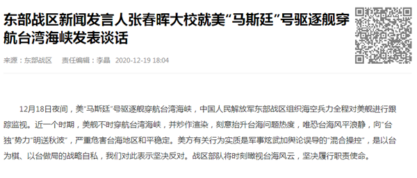 東部戰(zhàn)區(qū)新聞發(fā)言人張春暉大校19日就美“馬斯廷”號(hào)驅(qū)逐艦穿航臺(tái)灣海峽發(fā)表談話。