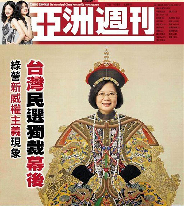 中國臺灣網12月28日訊 (記者 吳怡 李柏濤)最新一期香港《亞洲周刊》以蔡英文穿龍袍的諷刺漫畫為封面,專題報道臺灣“民選獨裁”的真相,并引述了張俊宏、林正杰、陳水扁、呂秀蓮等民進黨創黨元老的看法,反映臺灣主流民意,顯示各方對臺灣民選領袖“走向獨裁”的憂慮。多位兩岸學者認為,“民選獨裁”是對蔡英文最貼切的評語,也是民進黨及蔡英文甩不了的烙印,也佐證了所謂“臺式民主”在臺灣幾十年實踐的失敗,臺灣民眾要思考下次選舉時,是否還要投票給民進黨。