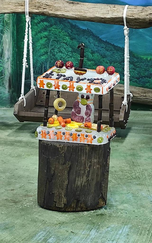 保育員精心設(shè)計了雙層冰塊蛋糕,上面有用蘋果雕刻的“平安快樂”四個字和用葡萄鋪成的“stay home”字樣。園方說,這些祝福也是希望眼下臺灣的新冠疫情早日結(jié)束,大家生活恢復(fù)正常。最上層的“1”字形甘蔗,象征周歲與愛的祝福。冰雕小熊置于中間并戴上奇異果雕花口罩,旁邊掛上窩窩頭做成的輪胎圈等“圓寶”喜歡的玩具,口罩與水果雕成的酒精噴罐是要提醒大家加強自我防疫。
