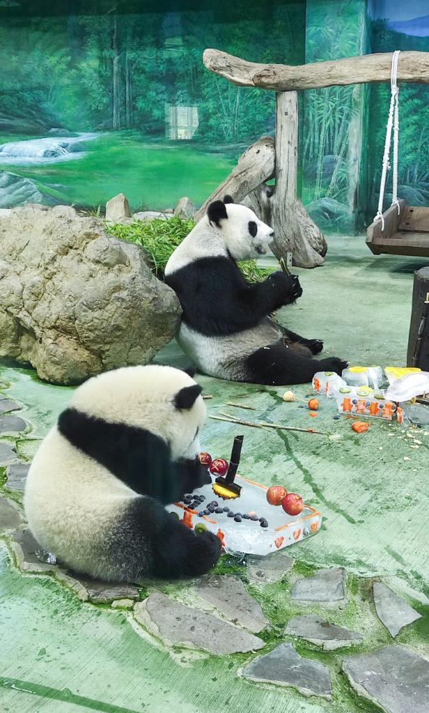 “圓寶”和媽媽“圓圓”一起享用蛋糕。圖片由臺北市立動物園提供。