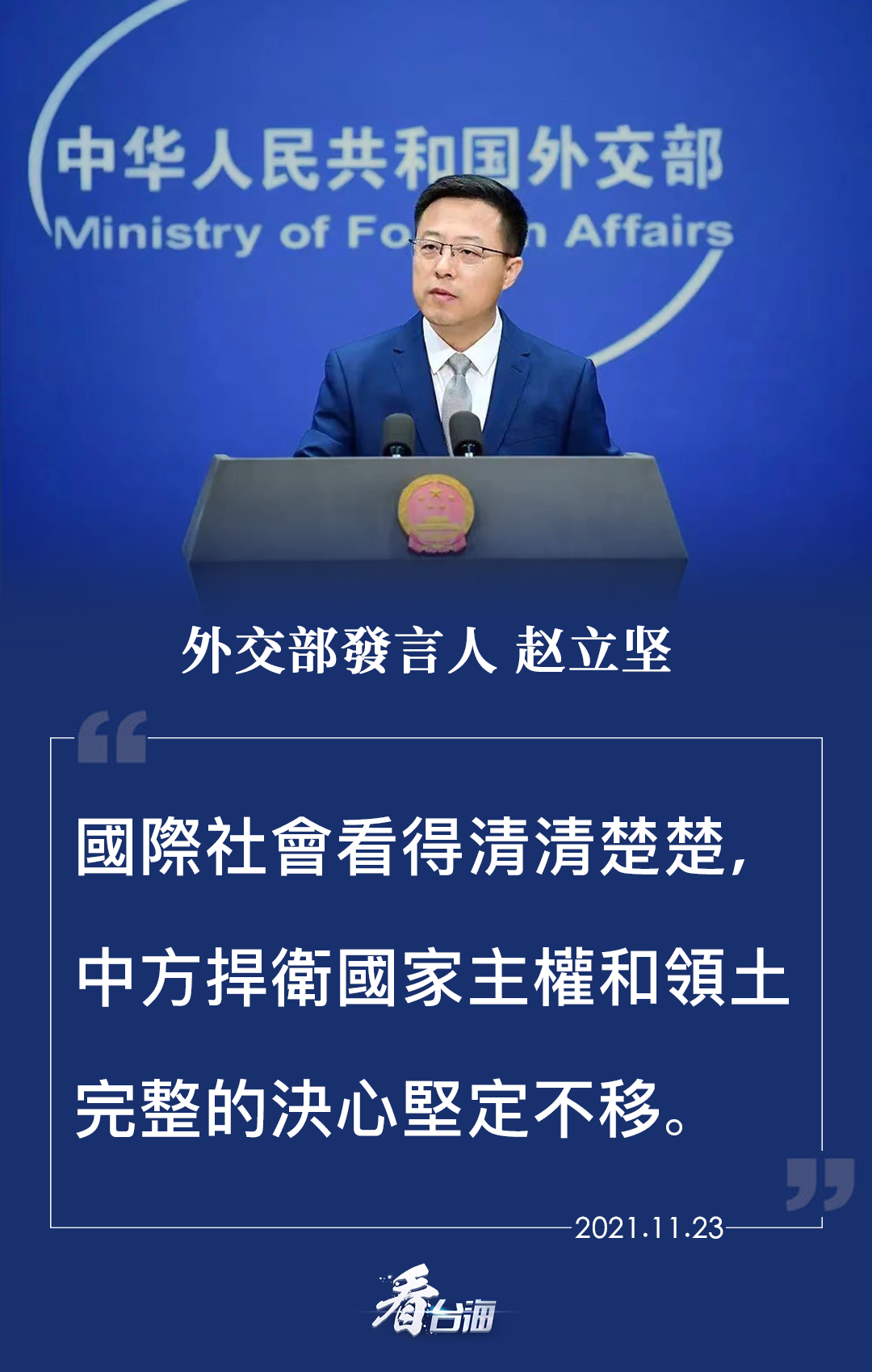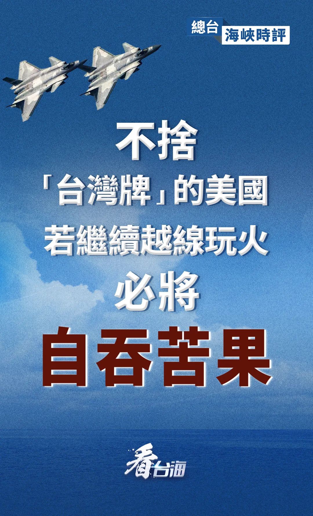 中國在臺灣問題上的原則立場已經(jīng)闡述得非常清楚,正如外交部發(fā)言人趙立堅23日再次強調(diào)的:中方捍衛(wèi)國家主權(quán)和領(lǐng)土完整的決心堅定不移。也正如中國人民解放軍一直以來所行動的:將采取一切必要措施,堅決反制一切威脅挑釁,堅決捍衛(wèi)國家主權(quán)和領(lǐng)土完整。奉勸美方立即糾正錯誤,停止打“臺灣牌”,多為地區(qū)和平與穩(wěn)定發(fā)揮建設(shè)性作用,倘若一再在臺海尋釁滋事,中國人民解放軍必將讓其付出代價。(據(jù)中央廣播電視總臺臺海之聲)