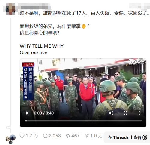 有網(wǎng)友在社交媒體上傳相關視頻表示,“欸不是啊,誰能說明在死了17人、百人失蹤、受傷、家園沒了,面對救災的弟兄,為什么擊掌?這是很開心的事嗎?”