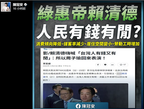 中國國民黨青年部前主任陳冠安評論稱,賴清德真是“綠惠帝”,根本是“何不食肉糜”翻版。他列舉數據表示,臺灣民眾儲蓄率已連續4年減少,2021年到2024年從25.23%下滑到23.73%。消費傾向從78.73%下降到76.27%,2024年的平均住宅坪數也創下2000年以來新低紀錄。民眾越來越窮,但有閑了嗎?他說,賴清德同樣錯得離譜。根據臺勞動部門數據,2024年每人每月平均工時達169.2小時,創6年新高,而每人每月加班工時8.5小時,更是10年最高,“人民有錢嗎?”