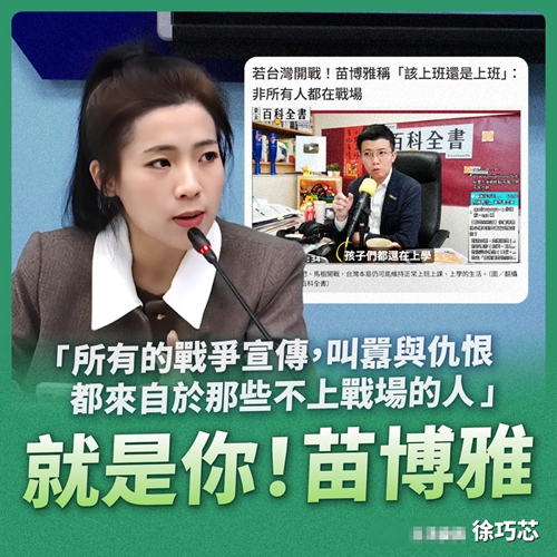 近日,臺北市議員苗博雅宣稱,即便臺灣發(fā)生戰(zhàn)爭,民眾仍可像烏克蘭一樣維持正常生活,“上班、上學、開店都不受影響”。其言論如同一顆投入輿論場的巨石,島內各界紛紛痛批其“美化戰(zhàn)爭”,折射出綠營政客的荒誕邏輯以及民進黨的雙重政治戲碼。