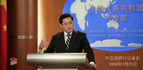 2008年3月25日下午,外交部發言人秦剛舉行例行記者會,就近期拉薩發生的打砸搶燒嚴重暴力犯罪事件等問題答問。