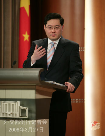 2008年3月27日下午,外交部發言人秦剛舉行例行記者會,就近期拉薩發生的打砸搶燒嚴重暴力犯罪事件和部分西方媒體歪曲、虛假報道等問題答問。