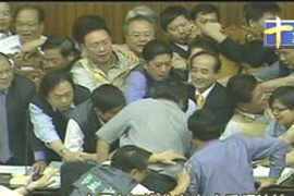 臺灣“立法院”打群架早就聞名全世界,一般上不了國際新聞。這一次干架的規模特別大,連“院長”王金平也掛了彩。幾位民進黨女“立委”以鞋子做暗器,砸中王金平的嘴角。另外有王幸男、蔡啟芳等民進黨“立委”以摩托車大鎖鎖住議場......《詳細》 | | |