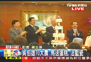 人物:國民黨慶吳伯雄70大壽 馬英九送蛋糕洪秀柱獻吻 |