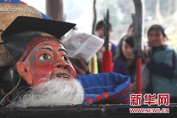 新晃侗族自治縣貢溪鄉(xiāng)四路村侗族群眾在觀看儺戲慶祝春節(jié)(2月3日攝)。