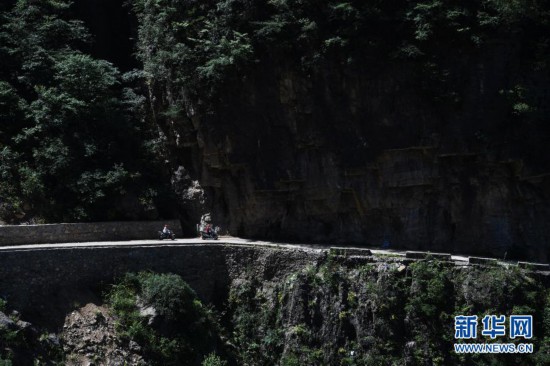 兩名下莊村村民騎著摩托車行駛在下莊村通往外界的公路上(2017年6月7日攝)。新華社記者 王全超 攝