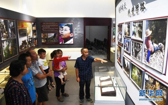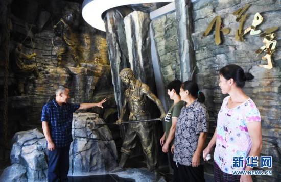 毛相林(左一)在下莊精神陳列館內(nèi)講述當(dāng)年修路的故事(2020年7月3日攝)。新華社記者 王全超 攝