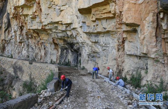 參與修路的下莊村村民在懸崖峭壁上打炮眼(資料照片)。新華社發(fā)