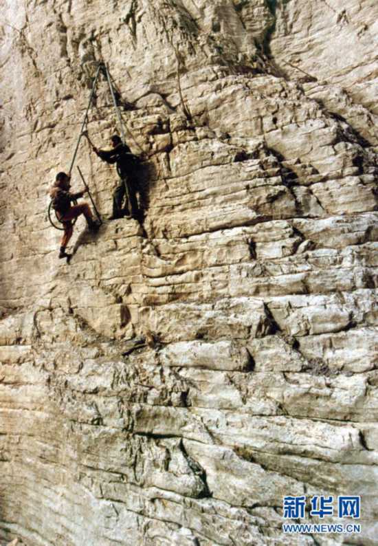 修路遠(yuǎn)比想象的難。四周陡峭巖壁,很難找到落腳之地,膽子大的腰系長(zhǎng)繩站在籮筐里,吊在幾百米高的懸崖邊鉆炮眼,先炸出一小塊立足之地,再用鋤頭、鋼釬和大錘,一塊一塊把石頭鑿下來(lái)。