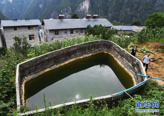 毛相林(前)經(jīng)過(guò)下莊村用于農(nóng)業(yè)生產(chǎn)的水池(2020年7月3日攝)。新華社記者 王全超 攝