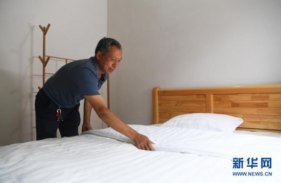 57歲的下莊村村民楊元鼎在自家開(kāi)辦的民宿內(nèi)整理床鋪(2020年7月3日攝)。新華社記者 王全超 攝