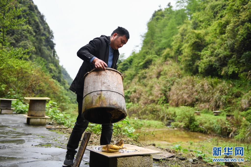 4月16日,在湖南湘西十八洞村,龍先蘭打開蜂箱清理掉落的蜂巢。新華社記者 陳思汗 攝