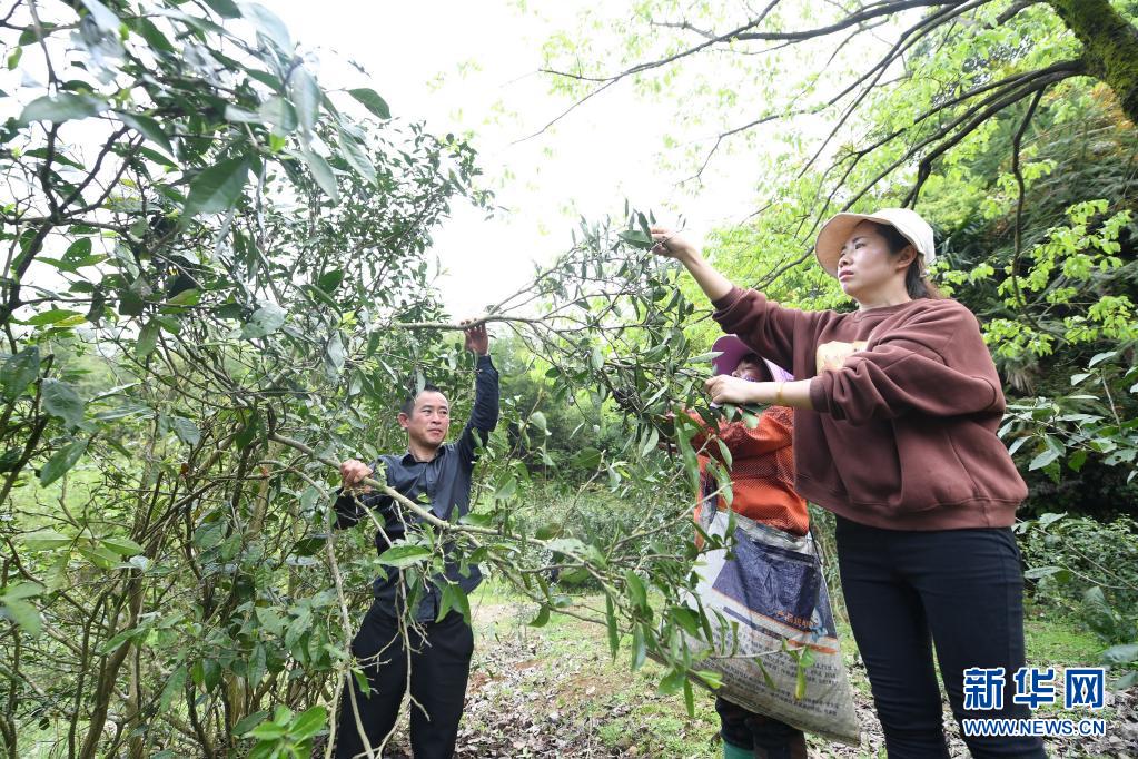 阿鐵(左)和他的愛人吳冒花(右)在深山里采摘荒野茶(4月1日攝)。新華社記者 林善傳 攝