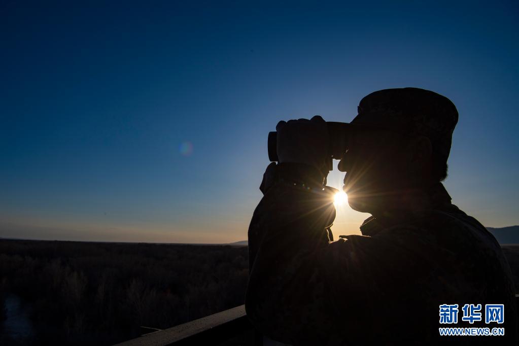 新疆生產(chǎn)建設兵團第10師185團職工馬軍武在瞭望塔上觀察管護轄區(qū)(4月9日攝)。新華社記者 胡虎虎 攝