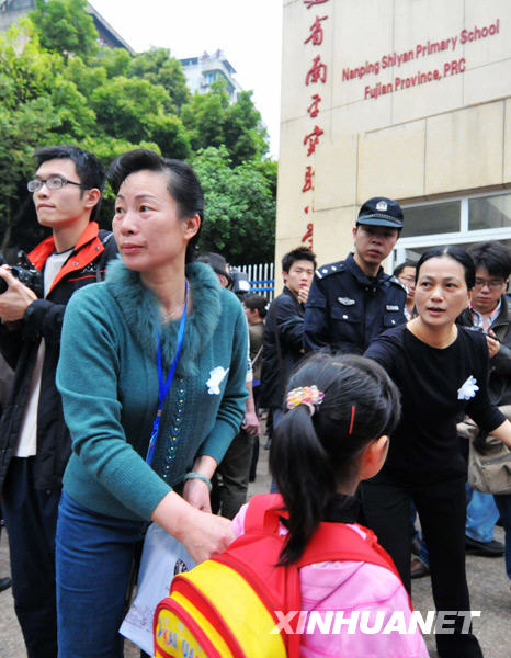 7時30分,南平市實驗小學(xué)的全體老師身著黑衣,胸佩白花,和警察一起排成人墻,站在校門外迎接經(jīng)過一日一夜身心折磨的孩子們。