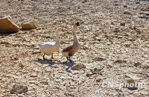 中國的旱情繼續呈發展態勢。截至2月20日,中國已有5336萬畝耕地受旱,1188萬人和805萬頭大牲畜因旱飲水困難。圖為云南省蒙自縣蒙自縣冷泉鎮雞白旦村,兩只鵝在干枯的水塘中游蕩。 中新社發 薛云 攝