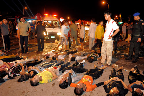 圖為23日,柬埔寨金邊,人們站在踩踏事件遇難者遺體旁。