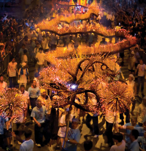 舞火龍是香港中秋傳統習俗之一,源于19世紀,傳承已逾百年。最初為居民為求消除瘟疫而起,如今成了香港獨特的風俗。鑼鼓聲中,近300人舞動著長達67米的巨大火龍穿梭大街小巷,平日寧靜的小巷變得火光閃爍。以往巡游結束后,村民會烹煮大鍋粥慰勞健兒,時至今日,“龍粥”已變為簡便的“龍餅”,即用紙袋裝著的合桃酥、雞仔餅、老婆餅和嚤啰酥,并附有祈求平安的“龍香”。