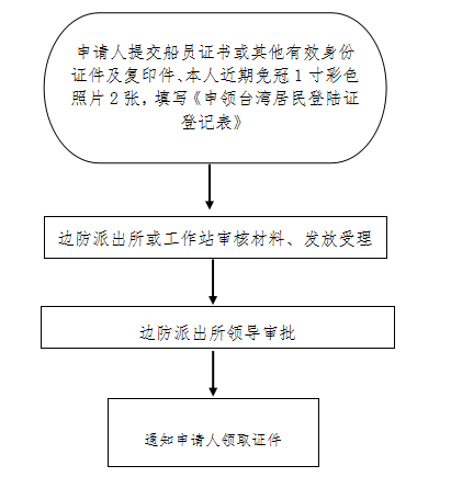 2.《臺灣漁船停泊點邊防治安管理辦法》(公安部令第63號)第三章第十一條:臺灣漁船上的臺灣居民需要登陸的,應當持船員證書或其他有效身份證件,向邊防工作站申請辦理臺灣居民登陸證。