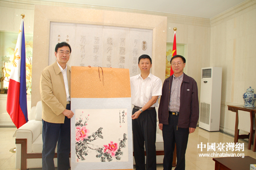 1月19日,第三屆“中國(guó)和平統(tǒng)一亞洲論壇”在馬尼拉圓滿閉幕。翌日(20日),中國(guó)統(tǒng)促會(huì)執(zhí)行副秘書(shū)長(zhǎng)李路、副秘書(shū)長(zhǎng)傅鐵生應(yīng)邀前往中國(guó)駐菲大使館,與中國(guó)駐菲律賓特命全權(quán)大使宋濤進(jìn)行座談,并向宋濤大使贈(zèng)送精美禮品。 (田云鵬 攝)
