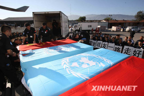 1月17日,在海地太子港,中國維和警察防暴隊(duì)隊(duì)員為遇難者送行。當(dāng)日,中國國際救援隊(duì)及中國維和警察防暴隊(duì)舉行儀式,送別在海地地震中遇難的公安部赴海地維和工作組4名成員和4名駐海地執(zhí)行聯(lián)合國維和任務(wù)的中國警察的遺體。中國南方航空公司的貨運(yùn)包機(jī)當(dāng)日將從海地運(yùn)送遇難中國維和人員的遺體回國。新華社記者 袁滿 攝