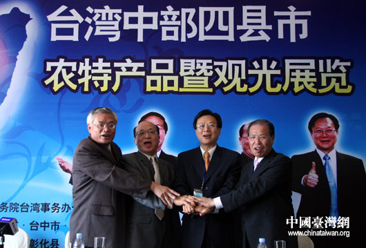 6月26日下午,臺(tái)灣南投縣農(nóng)業(yè)處處長(zhǎng)陳朝旺、臺(tái)中市市長(zhǎng)胡志強(qiáng)、彰化縣縣長(zhǎng)卓伯源、臺(tái)中縣縣長(zhǎng)黃仲生(由左至右)率團(tuán)進(jìn)京展覽營(yíng)銷中臺(tái)灣農(nóng)特產(chǎn)品及觀光,四人將手緊握為中臺(tái)灣“加油”助威。(中國(guó)臺(tái)灣網(wǎng) 鐘寶華 攝)