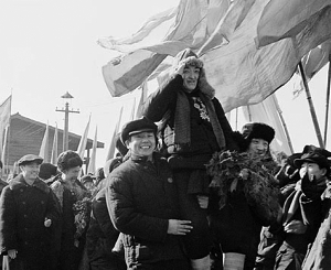 1954年,東北各地的工人和農(nóng)民們?cè)诖汗?jié)期間展開盛大的工農(nóng)聯(lián)歡活動(dòng)。圖為東北各省農(nóng)業(yè)勞動(dòng)模范參觀團(tuán)到達(dá)遼寧省鞍山市時(shí),受到工人們的熱烈歡迎。資料圖片