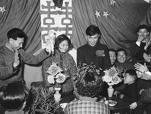 春節(jié)是結(jié)婚的好日子。這是1957年春節(jié),遼寧省沈陽風(fēng)動(dòng)工具廠的工人鞠復(fù)海(新郎)和俞鳳仙(新娘)在婚禮儀式上接受朋友們的祝賀。資料圖片