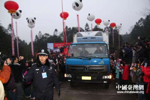 12月23日,四川雅安碧峰峽基地舉行大熊貓赴臺啟動儀式。運載“團團”、“圓圓”的運輸車駛出碧峰峽基地。中國臺灣網 田云鵬 攝