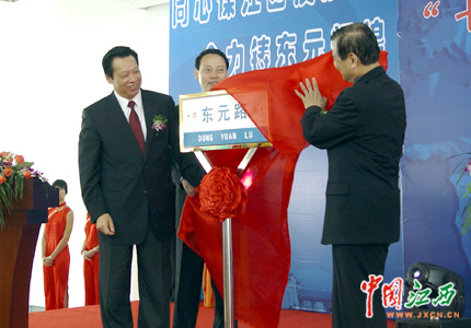 江西省委副書記、常務副省長吳新雄(左一),省委常委、南昌市委書記余欣榮(左二),東元集團董事長黃茂雄(右一)為“東元路”揭牌。(中國江西新聞網記者 王凱 攝)