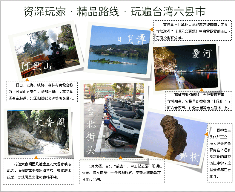 | 阿里山的姑娘,日月潭的水,翻過(guò)斷崖峭壁的太魯閣是太平洋無(wú)垠的蔚藍(lán)風(fēng)光,還有齒頰留香的高山茶和充滿故事的宮廷珍品。來(lái)自北京的葉老先生表示:臺(tái)灣就像一個(gè)瑰麗神奇的大盆景,山青水美,風(fēng)情無(wú)限!耙郧... |
